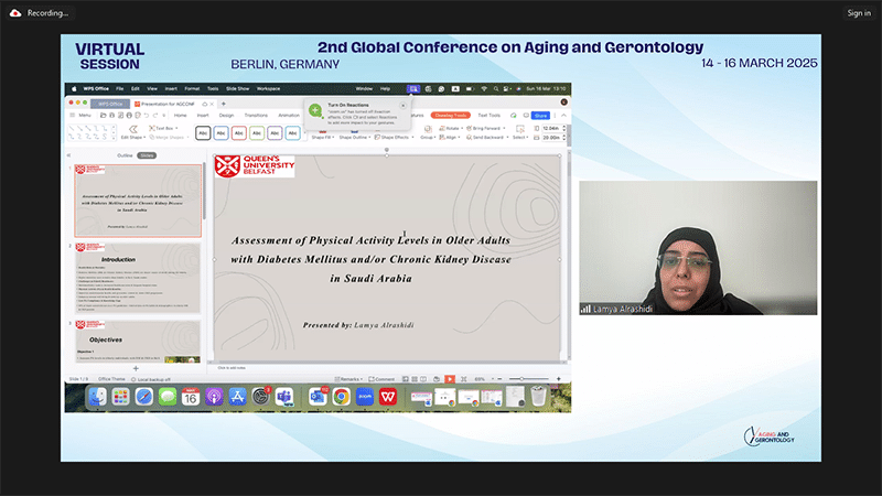 | Lamya Alrashidi | Queens University Belfast, United Kingdom | Assessment of Physical Activity Levels in Older Adults with Diabetes Mellitus and/or chronic kidney disease in Saudi Arabia |