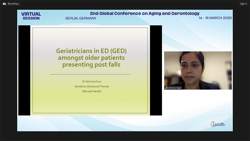 | Dr Amrina Kaur | Monash Health, Australia | An observational study of geriatrician reviews in elderly patients presenting with falls to an emergency department (ED) of a tertiary hospital |