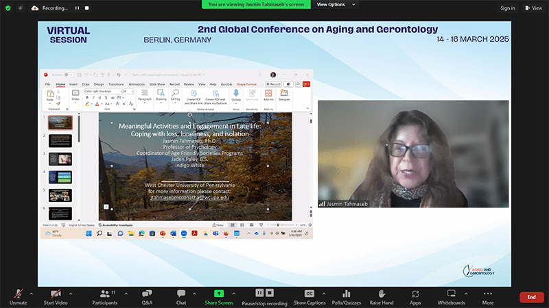 | Dr Jasmin Tahmaseb | West Chester University of PA, United States | Meaningful Activities and Engagement in Late Life: Coping with Loss, Loneliness, and Isolation |