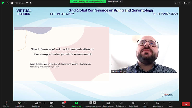 | Jakub Husejko | Nicolaus Copernicus University in Toruń, Poland, Poland | The influence of uric acid concentration on the comprehesive geriatric assessment, as exemplified by the results of selected geriatric scales routinely performed in Poland |