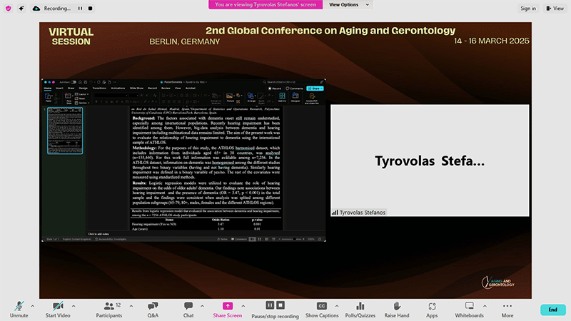 | Dr Stefanos Tyrovolas | Goerge Mason University, United States | Hearing impairment as risk factor for Dementia: a cross-sectional big-data analysis among older adults |